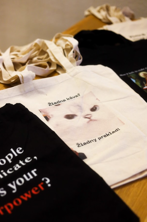 Pre našich podporovateľov a podporovateľky máme aj merch! Ponúkame ho za dobrovoľný príspevok na všetkých našich akciách a podujatiach. Nájdete u nás tieto prekladateľské vecičky: