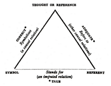 Trojuholníkový diagram a.k.a. semiotický trojuholník, je uvedený na začiatku tejto kapitoly ako súčasť základnej štruktúry, ktorú autori použili v celej knihe. Skladá sa, neočakávane, z troch hlavných častí: symbol, referent a myšlienka či referencia a vysvetľuje, ako sa pomocou jazyka vytvára význam.